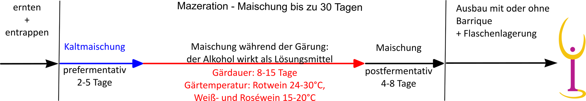 Im Grunde wird dieses Verfahren nur bei Rotweinen angewendet, weil nur bei diesen der Trester sich noch im Gärtank befindet. Der entstehende Alkohol wirkt als Lösungsmittel zur weiteren Extraktion von Inhaltsstoffen. Die Dauer ist sehr unterschiedlich und beeinflusst den Wein farblich, aromatisch, geschmacklich und haptisch deutlich.